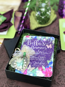 I couldn't wait to get started! I first started with the invitation design. I wanted it to be over the top magical! Like I have done in the past, I decided to use a black jewelry box, filled it with green moss and added some large glitter for extra sparkle. I then place the invitation on top of the moss along with a darling butterfly pendant necklace tucked neatly inside a gold organza bag and topped it with a life like dragonfly. Each box was completed with a beautiful plum satin ribbon tied into a lovely bow and a beautiful tag that coordinated perfectly with the invitation with each girls name on it. For an extra special touch, we hand delivered each invitation. I can't tell you how special each girl felt to receive such a magical invitation! They all couldn't wait to attend the party!