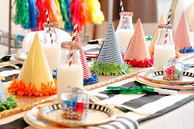 The tabletop was whimsical and fun, starting with a white tablecloth topped with a wide black and white striped runner and finally a thinner gold sequined runner down the center of that. Using the adorable party hats down the center made for a super fun yet super simple display! Each place setting was made up of a gold plate topped with a whimsical color wheel plate, topped by a cute clock dessert plate and finished with a darling little "Ring Pop" favor box. The milk glasses had festively sugared rims and black and white striped straws! And finally, no NOON Year's Eve Party would be complete without a party horn!